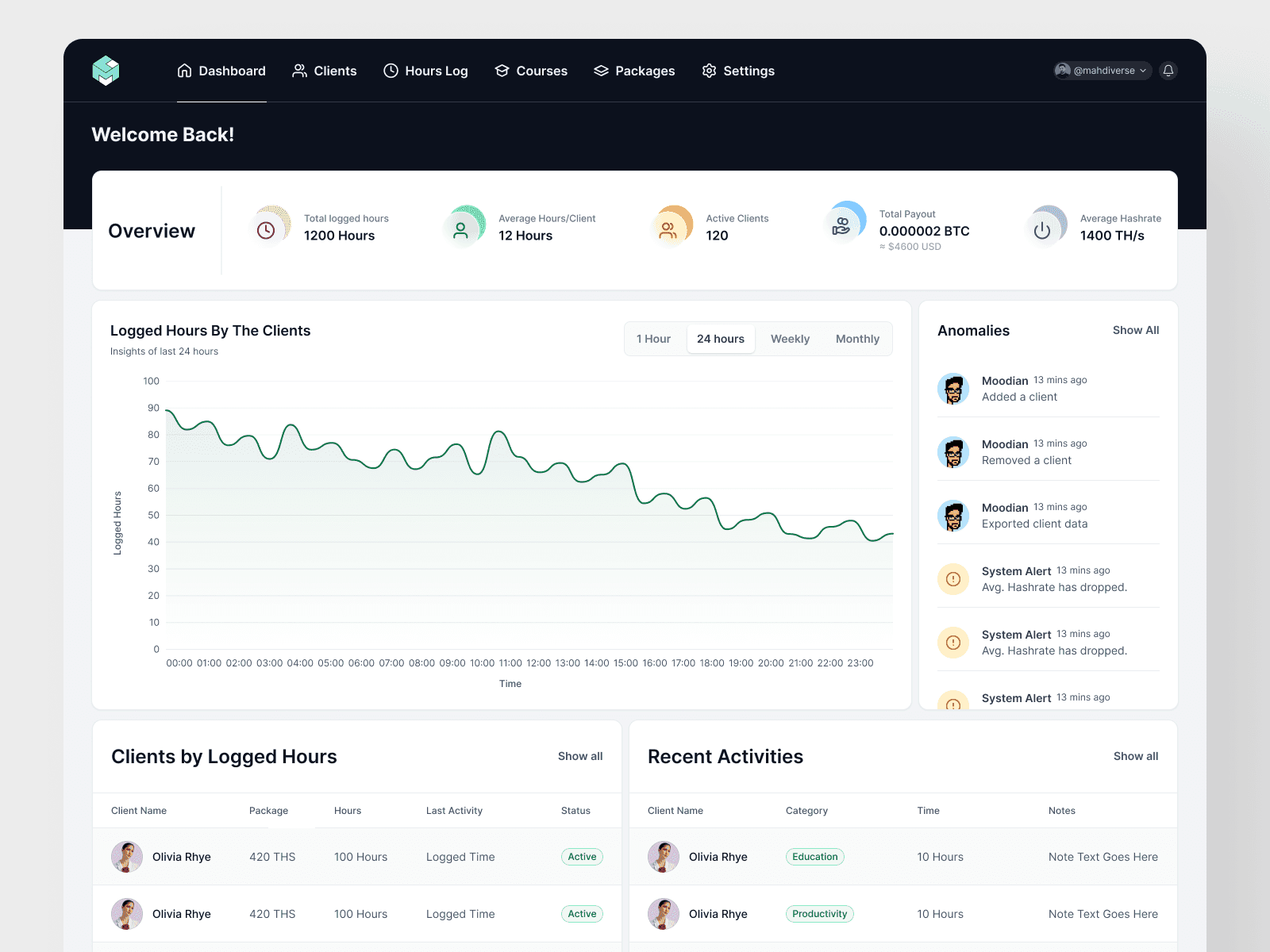Leveraged Mining is a web portal that helps Bitcoin mining clients document 100+ hours of business participation per year while also giving them a simple way to monitor mining performance, learn through curated content, and reach support. I designed the client product and admin system end to end, prioritizing credibility and consistent behavior over automation.